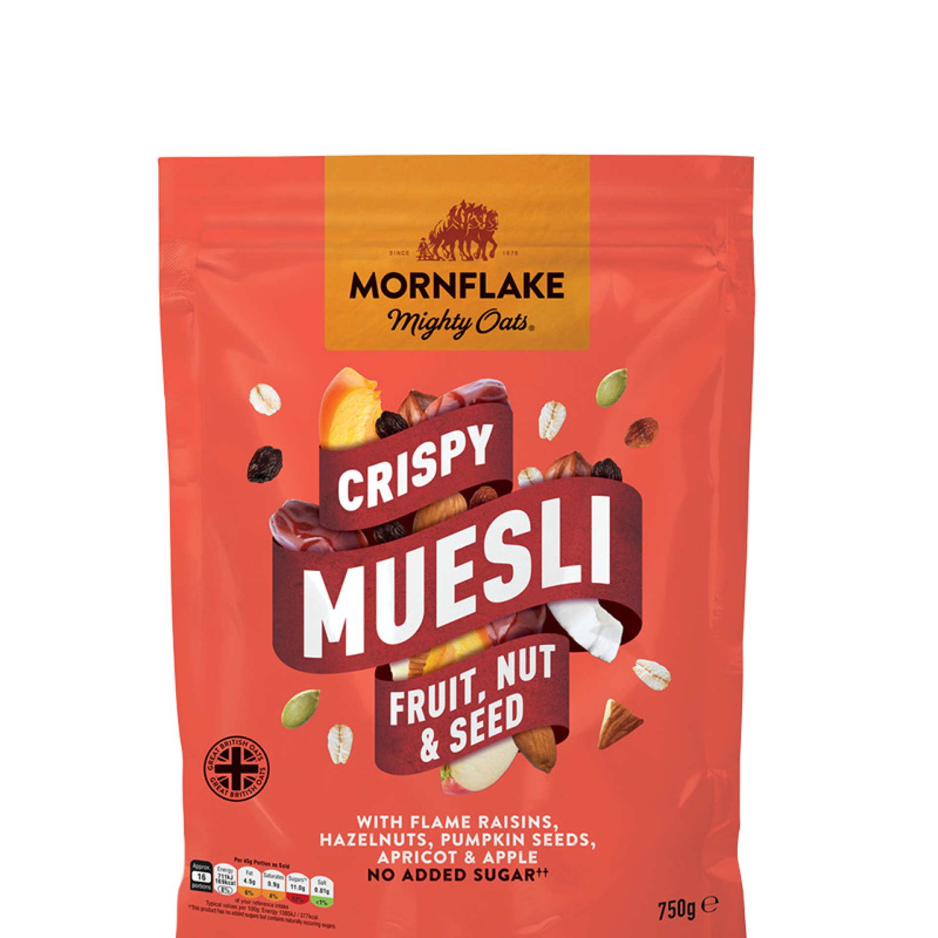 Το Crispy Muesli Fruit, Nut & Seed είναι ένας γευστικός συνδυασμός από νιφάδες δημητριακών ολικής άλεσης, μεγάλα κομμάτια φρούτων και καβουρδισμένους καρπούς για ένα πρωινό που σαγηνεύει τις αισθήσεις. Στο μείγμα θα βρείτε άφθονη ποσότητα από δύο τύπους σταφίδας, χουρμάδες, βερίκοκα, μήλα, καθώς και αμύγδαλα και φουντούκια, ή κολοκυθόσπορους και ηλιόσπορους. Για να ενισχυθεί η ιδιαίτερη γεύση του μείγματος, προστέθηκε καβουρδισμένη καρύδα, η οποία πρόσθεσε στο μούσλι ένα λεπτό και ευχάριστο άρωμα. Το προϊόν αποτελεί πηγή σύνθετων υδατανθράκων και φυτικών ινών, ενώ δεν περιέχει πρόσθετο αλάτι ή ζάχαρη.